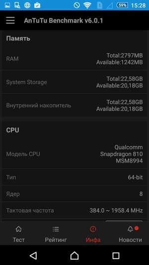 - SoC Qualcomm Snapdragon 810, 8 ядер: 4×2,0 ГГц (ARM Cortex-A57) + 4×1,5 ГГц (ARM Cortex-A53)