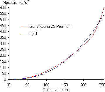 Контрастность (примерно в центре экрана) высокая — порядка 1060:1. Время отклика при переходе черный-белый-черный равно 26 мс (16 мс вкл. + 10 мс выкл.). Переход между полутонами серого 25% и 75% (по численному значению цвета) и обратно в сумме занимает 35 мс. Построенная по 32 точкам с равным интервалом по численному значению оттенка серого гамма-кривая не выявила завала ни в светах, ни в тенях, а показатель аппроксимирующей степенной функции получился 2,40, что выше стандартного значения 2,2, впрочем, это не имеет никакого значения, так как реальная гамма-кривая заметно отклоняется от степенной зависимости: