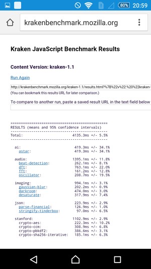| Mozilla Kraken (мс, меньше — лучше) | 4135 | 4769 | 5103 | 15535 | 9571 |
