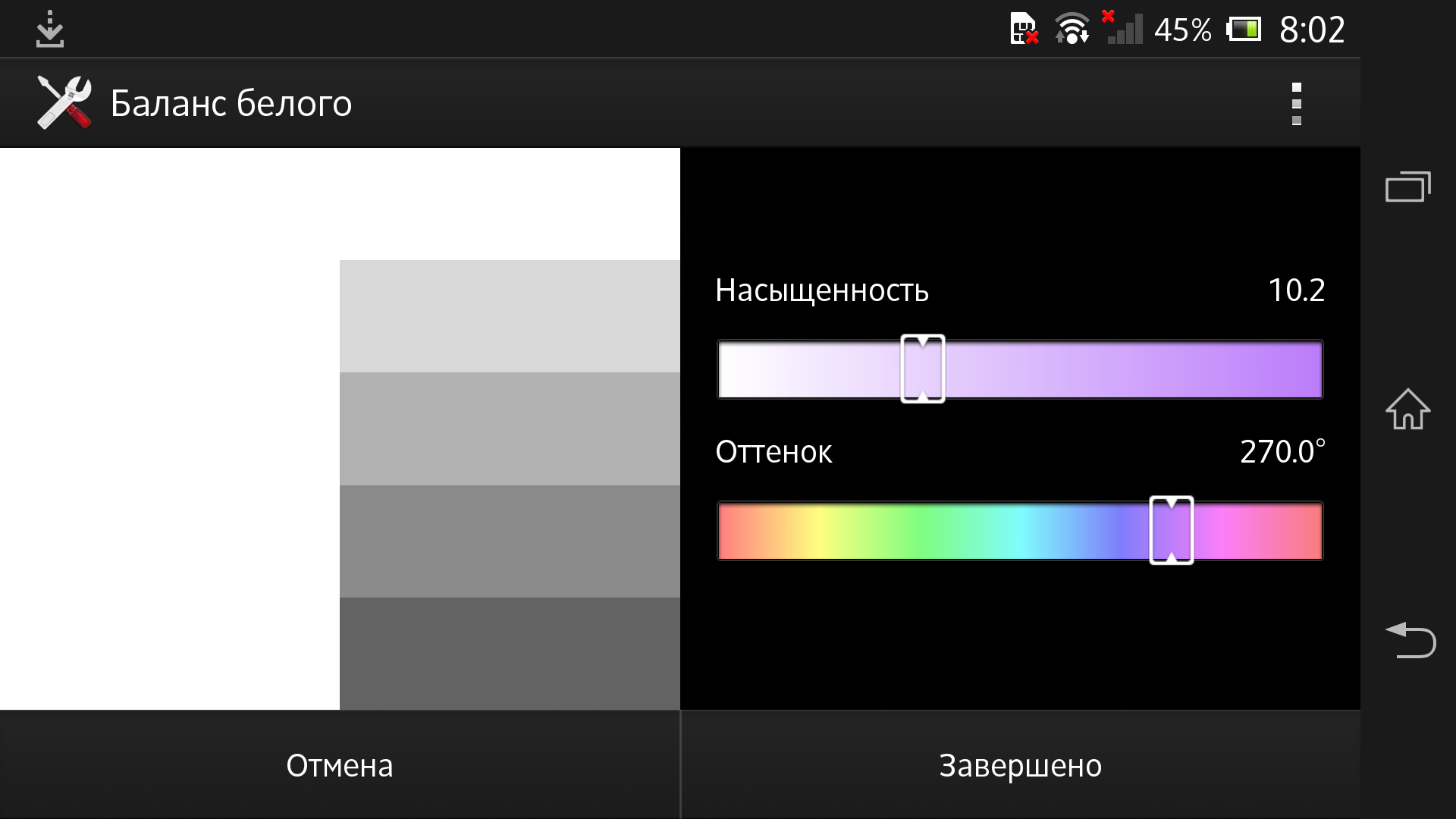 В целом к цветовому балансу и так нет особых претензий, но его можно попробовать улучшить, так как в данном смартфоне есть возможность подстроить баланс оттенков серого с помощью двух ползунков, меняющих цвет добавочного оттенка и его насыщенность: