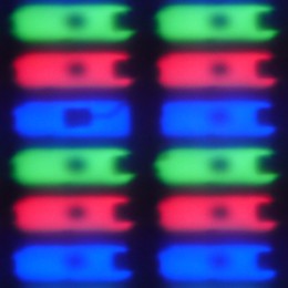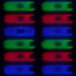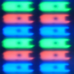 Но настаивать на этой версии мы не будем. Темный прямоугольник с хвостиком, присутствующий на некоторых синих субпикселях, возможно, является частью емкостного датчика, интегрированного в ЖК-панель. Интересно, что для компенсации уменьшения яркости площадь таких субпикселей немного увеличена. Фотография ниже показывает, как чередуются эти субпиксели: