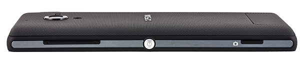 Однако что касается задней части, здесь все совсем по-другому. Тыльная поверхность выполнена в стиле «практичного» дизайна, в котором поверхности глянца не имеют, а наоборот, снабжены прорезиненным покрытием soft-touch. Таким образом, пластиковая рифленая матовая задняя крышка у Sony Xperia ZL выглядит так, как будто она «не отсюда». Матовый практичный пластик плохо сочетается внешне с утонченными зеркальными боковыми вставками, в которых можно даже разглядеть свое отражение. Эти две части из разных миров, и очевидно, что обыкновенные пластиковые боковинки из того же материала, что и задняя крышка, были бы модели Sony Xperia ZL более к лицу, чем эти гламурные зеркальца, пришедшие сюда совсем от другой модели.