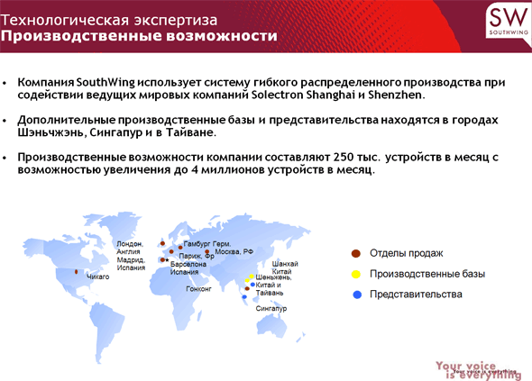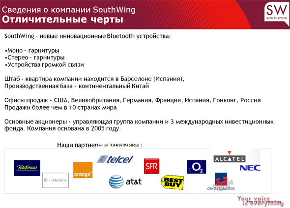Итак, что собой представляет SouthWing? Это компания, специализирующаяся на рынке Bluetooth-аксессуаров для мобильных телефонов: моно- и стереогарнитур, а также автомобильных комплектов. Что в последнее время традиционно, головной офис и дизайнеры «сидят» в Испании, в то время как производственная база расположена в материковом Китае. Компания основана всего три года назад, однако за прошедшее время развернула деятельность уже в 10 странах. Причем первое время она работала, в основном, в стратегическом контакте с операторами мобильной связи и только в прошлом году начала активное продвижение на розничный рынок. «Молодости» компании можно не опасаться — у большинства ее сотрудников «за плечами» богатый опыт работы в Ericsson, Nokia, Siemens, Philips, Vodafone и т.п., а главный исполнительный директор компании Винсент Пена на пресс-конференции упомянул, что первый раз он в Москве побывал в бытность работы на Jabra.