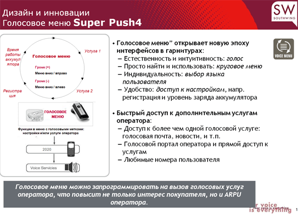 Главным «открытием» инженеров SouthWing является функция Push4. Что она собой представляет? Всего лишь возможность легко и просто позвонить на нужный номер, не доставая телефон и не используя даже голосовой набор. Она может быть настраиваемой покупателем, что имеет достаточно большой смысл — по статистике до 50% звонков абонентов идет всего на один номер (например, муж звонит жене, ребенок — маме, и т.д. и т.п.). Запрограммируем этот номер на Push4 и все — позвонить можно быстро и удобно. Но наиболее популярной стала данная функция у мобильных операторов, совместно с которыми SouthWing осваивал многие рынки (где гарнитуры SouthWing давно доступны под брендами T-Mobile, Telefonica, Vodafone, Orange, AT&T и другими). Причина понятна — если еще до продажи «забить» в гарнитуру номер, например, голосового портала оператора, пользователи будут пользоваться им куда более охотно, чем если бы им пришлось этот номер набирать. Причем это может быть и платный номер — все равно популярность услуги будет большей, чем могла бы без использования новых технологий продвижения. По отзывам операторов, при грамотном использовании Push4 позволяет им повысить уровень дохода с одного абонента в среднем аж на 20% — для крайне конкурентного европейского рынка, вообще-то, это очень много и сравнимо с очень мощными маркетинговыми компаниями. Так что ничего удивительного, что на Западе операторы готовы давать абонентам очень высокие скидки при продаже оборудования — как я уже сказал в начале статьи, основные расходы там приходятся на услуги, так что при таком приросте ARPU даже бесплатно гарнитуры раздавать все равно выгодно ;)