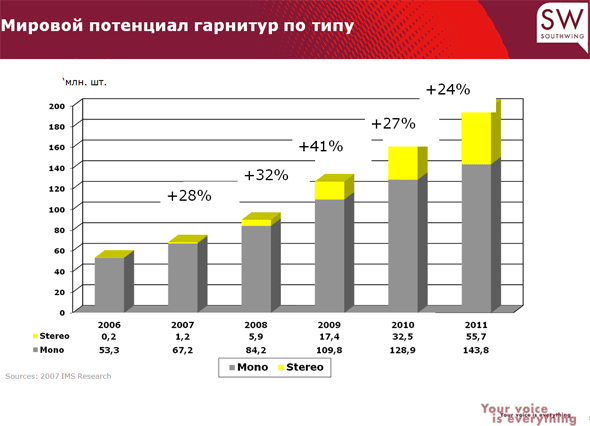 Теперь немного поговорим о рынке. Хорошо заметно, что быстрее всего в настоящее время растет сегмент стереогарнитур. Причина проста: телефоны и коммуникаторы учатся воспроизводить музыку и видео все лучше. Однако несложно заметить, что в абсолютных цифрах выглядит он весьма скромно и лишь через пару лет будет составлять заметную долю, а сейчас лишь каждая седьмая ВТ-гарнитура стереофоническая. Дело в том, что многие покупатели используют комплектные проводные гарнитуры (обычно к музыкальным аппаратам они всегда прикладываются) или старые наушники через переходник подключают (они уже могут быть куплены ранее, поскольку «схлопывается» рынок традиционных мультимедийных плееров). От покупки ВТ-стерео первых отпугивает более высокая цена, а вторых — все же несколько более низкое качество звука, чем у сравнимых по цене «обычных» наушников. Но все равно — рост в этом сегменте очень заметный, так что упускать его из виду нельзя. Хотя основные продажи, по-прежнему, приходится и в ближайшее время будут приходиться на монофонические устройства.