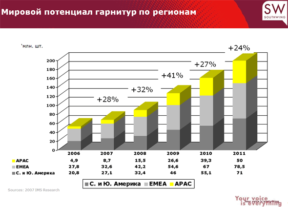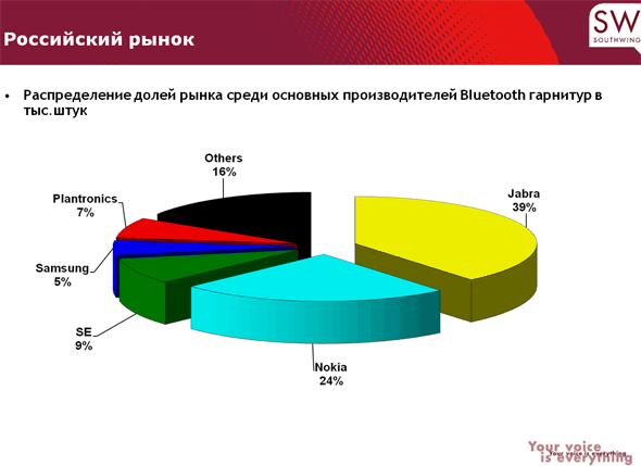 Осенью этого года список компаний-производителей Bluetooth-гарнитур, активно работающих на российском рынке пополнился еще одним именем — 23 сентября об открытии представительства в Москве объявила компания SouthWing, имеющая неплохие позиции на европейском рынке. Попутно с этим были представлены две новых модели гарнитур и два автомобильных устройства. Оборудование, впрочем, мы предпочитаем сначала тестировать, а потом уже о нем рассказывать (оперируя полученными самостоятельно данными, а не только информацией от производителя), однако на пресс-конференции было приведено немало интересных фактов как о компании, так и о рынке гарнитур (и мировом, и российском). Давайте изучим все это более подробно.