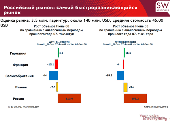 Если же мы попробуем рассмотреть европейский рынок более пристально, становится сразу ясно, почему всех производителей так заинтересовала Россия. На слайде приведено сравнение первого полугодия 2008 года с аналогичным периодом 2007 года, причем как в штуках, так и в деньгах, по пяти странам. Если говорить про натуральные объемы продаж, то видно, что ростом могут похвастаться только Россия и Германия, в то время, как в Великобритании (где процесс «гарнитуризации» начался раньше и шел активнее) рынок «просел» в полтора раза. В денежном исчислении все менее печально, поскольку интерес покупателей смещается от дешевых моделей к более дорогим, но все равно — в двух странах из пяти рынок уменьшился. А вот в России как раз период роста, причем весьма бурный — более чем в два раза как ни считай. Да и в обещанном скачке 2009 года наше участие тоже обещает быть немалым.