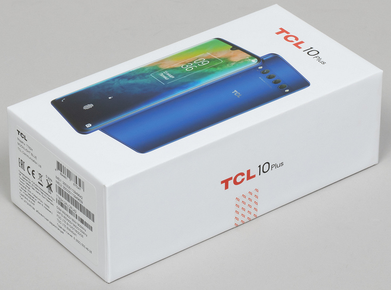 TCL 10 Plus поставляется в стандартно оформленной картонной коробке без особых дизайнерских изысков.