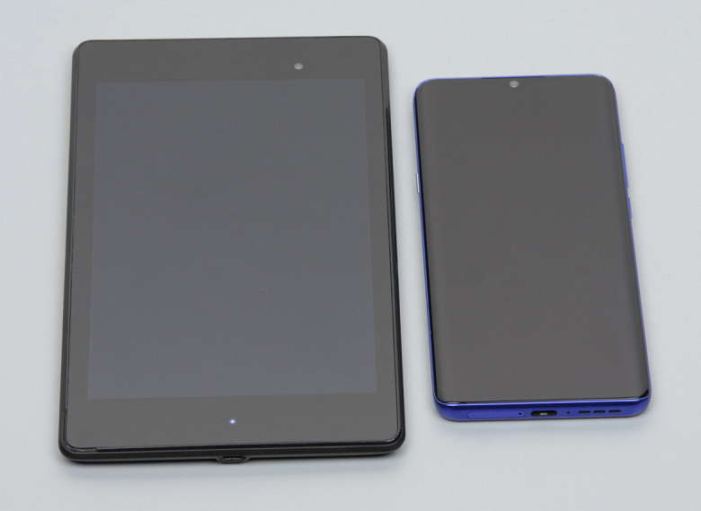 Лицевая поверхность экрана выполнена в виде стеклянной пластины с зеркально-гладкой поверхностью, устойчивой к появлению царапин. Судя по отражению объектов, антибликовые свойства экрана не хуже, чем у экрана Google Nexus 7 (2013) (ниже просто Nexus 7). Для наглядности приведем фотографию, на которой в выключенных экранах отражается белая поверхность (слева — Nexus 7, справа — TCL 10 Plus, далее их можно различать по размеру):