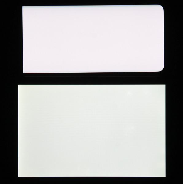 Экран характеризуется великолепными углами обзора. Правда, белый цвет при отклонении даже на небольшие углы приобретает легкий сине-зеленый оттенок, но черный цвет остается просто черным под любыми углами. Он настолько черный, что параметр контрастности в данном случае просто неприменим. Для сравнения приведем фотографии, на которых на экраны TCL 10 Plus и второго участника выведены одинаковые изображения, при этом яркость экранов изначально установлена примерно на 200 кд/м², а цветовой баланс на фотоаппарате принудительно переключен на 6500 К.