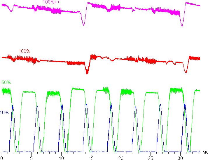 На любом уровне яркости присутствует значимая модуляция с частотой примерно 60,5 или 242 Гц. На рисунке ниже приведены зависимости яркости (вертикальная ось) от времени (горизонтальная ось) для нескольких значений настройки яркости.