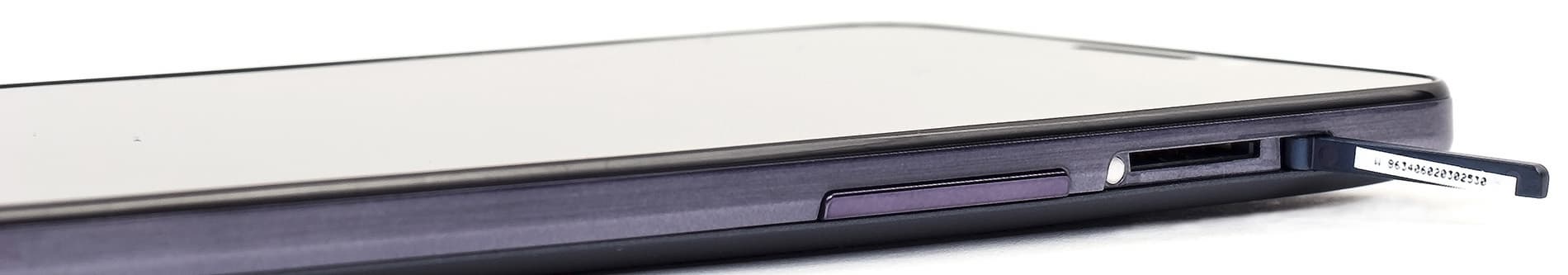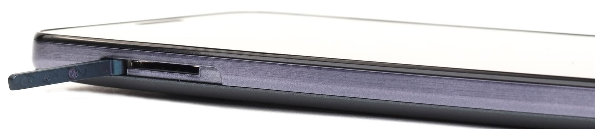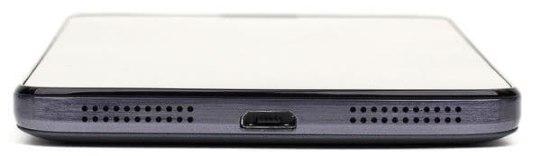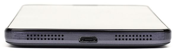Отверстия для выхода звука из вызывных динамиков прорезаны здесь двумя рядами мелких отверстий прямо в нижнем торце, и ничто не перекрывает звук, если телефон лежит на поверхности стола. В центре нижнего торца расположен универсальный разъем Micro-USB, поддерживающий режим подключения внешней периферии, от мышки до флэш-накопителя.