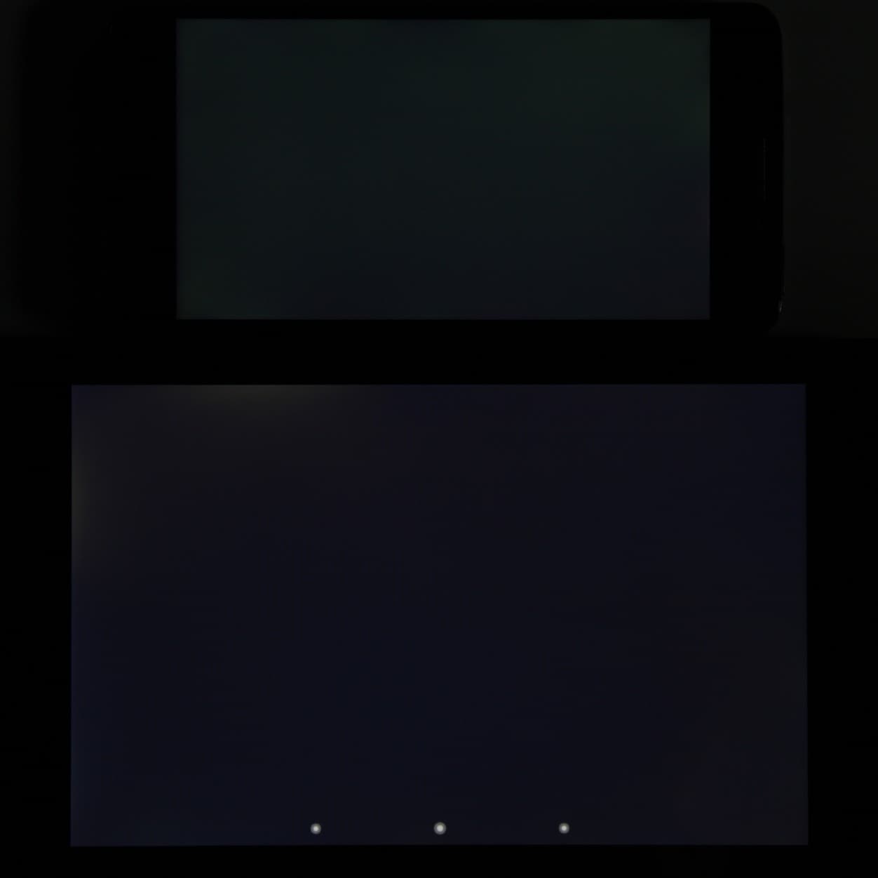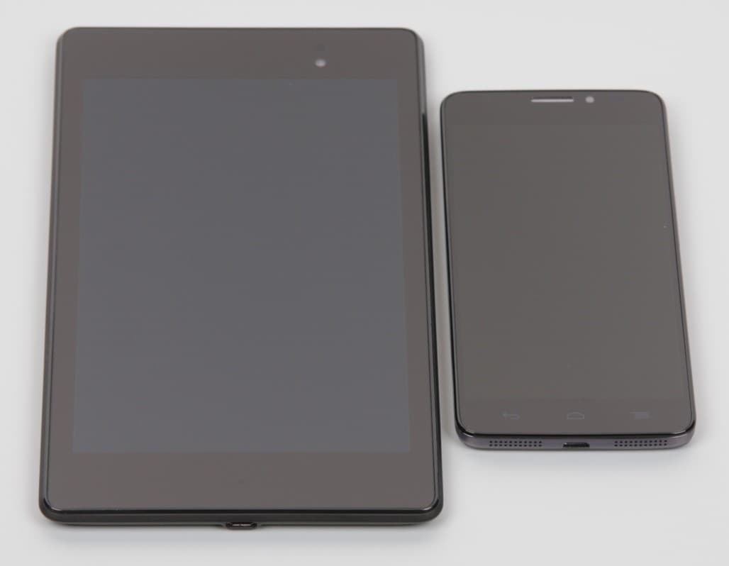 Лицевая поверхность экрана выполнена в виде стеклянной пластины с зеркально-гладкой поверхностью, устойчивой к появлению царапин. Судя по отражению объектов, имеется эффективный антибликовый фильтр, который по снижению яркости отражения лучше, чем у Google Nexus 7 (2013) (далее просто Nexus 7). Для наглядности приведем фотографию, на которой в выключенных экранах отражается белая поверхность (слева — Nexus 7, справа — TCL Idol X+, далее их можно различать по размеру):
