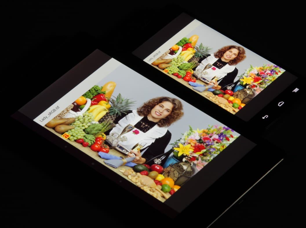 Экран имеет хорошие углы обзора без значительного сдвига цветов даже при больших отклонениях взгляда от перпендикуляра к экрану и без инвертирования оттенков. Для сравнения приведем фотографии, на которых на экраны TCL Idol X+ и Nexus 7 выведены одинаковые изображения, при этом яркость экранов изначально установлена примерно на 200 кд/м². Перпендикулярно к экранам белое поле: