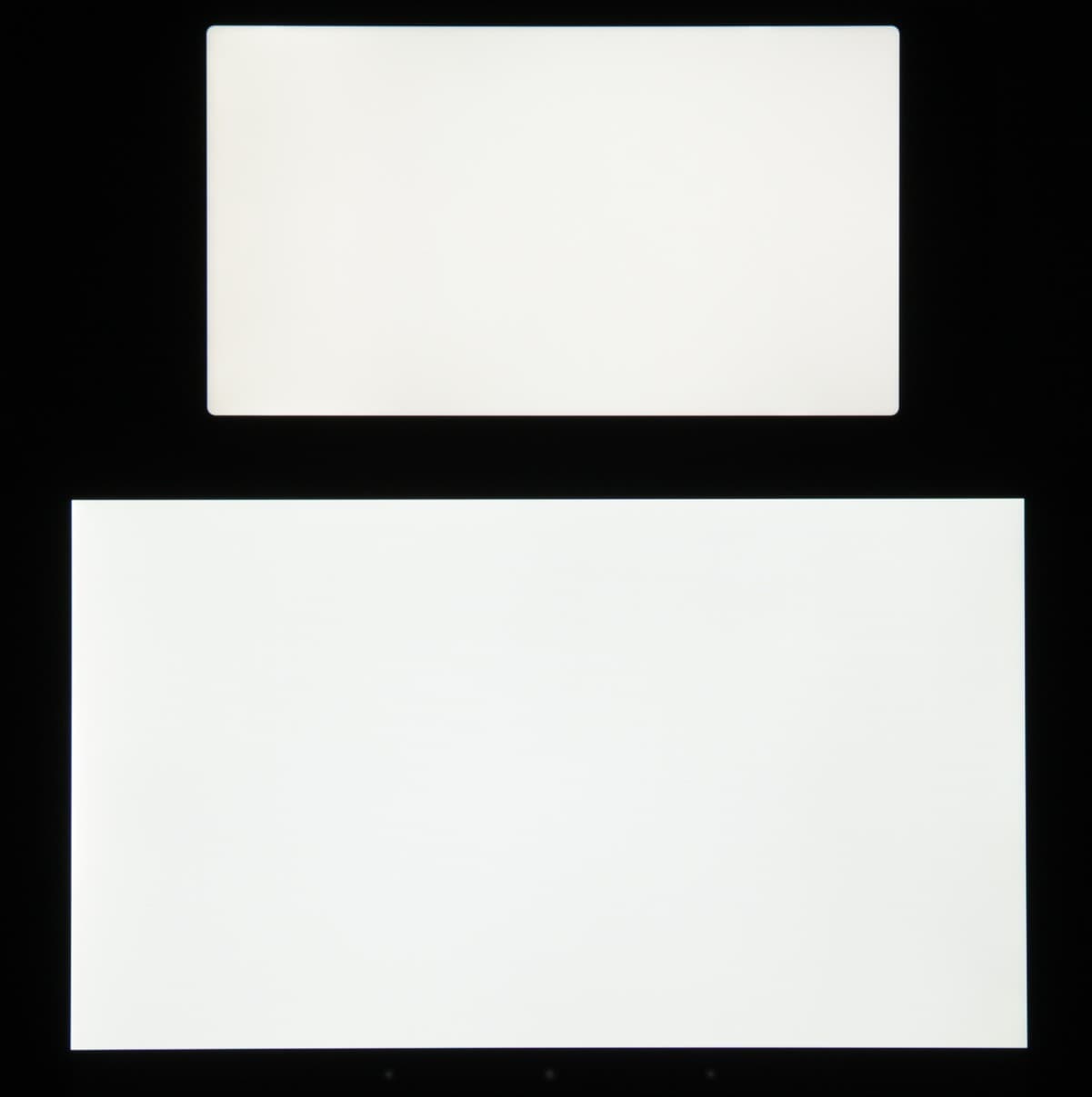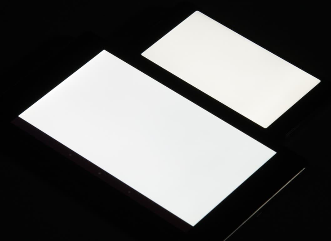 Яркость под углом у экранов уменьшилась (как минимум в 5 раз, исходя из разницы в выдержке) и уменьшилась примерно одинаково. Черное поле при отклонении по диагонали высветляется слабо и приобретает фиолетовый или красно-фиолетовый оттенок. Фотографии ниже это демонстрируют (яркость белых участков в перпендикулярном плоскости экранов направлении у экранов одинаковая!):