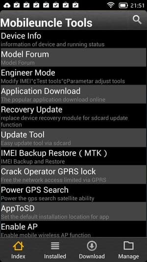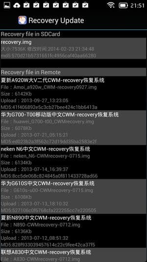 Выбираем в Mobileuncle пункт меню под названием Recovery Update, и в первой строке под заголовком Recovery file in SDcard мы должны увидеть наш файл с образом, который называется recovery.img, и информацию о нем. Жмем на этот файл, наблюдаем процесс установки, после его завершения соглашаемся с предложением перезагрузиться в режиме recovery. (Важно: не нужно пытаться загрузить образы из сети, которые предлагаются ниже в списке!)