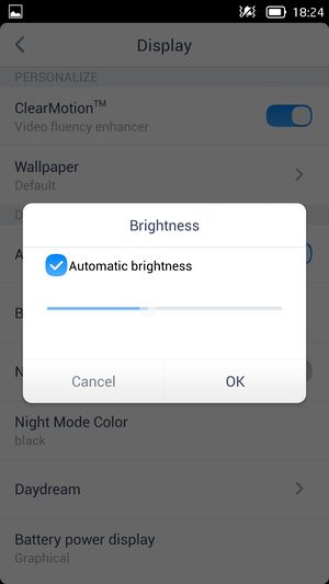 При ручном управлении яркостью и при выводе белого поля во весь экран максимальное значение яркости составило около 500 кд/м², минимальное — 62 кд/м². Максимальная яркость очень высокая, значит, учитывая эффективный антибликовый фильтр, читаемость даже в солнечный день вне помещения должна быть на отличном уровне. В полной темноте яркость можно понизить до комфортного уровня. Есть и специальный режим для любителей почитать в полной темноте, в котором минимальная яркость составляет 4 кд/м², а максимальная — 30 кд/м². В наличие автоматическая регулировка яркости по датчику освещенности (находится справа от глазка фронтальной камеры). В автоматическом режиме при изменении внешних условий освещенности яркость экрана как повышается, так и понижается. В полной темноте в автоматическом режиме яркость уменьшается где-то до 20 кд/м² (читать еще можно), в условиях освещенного искусственным светом офиса (примерно 400 лк) яркость устанавливается на 200 кд/м² (оптимально), в ярко освещенном окружении (соответствует освещению ясным днем вне помещения, но без прямого солнечного света — 20000 лк или немного больше) повышается до 440 кд/м² (ниже максимума, но для этого экрана достаточно). В итоге функция автоподстройки яркости работает абсолютно адекватно. На любом уровне яркости модуляция подсветки практически отсутствует, поэтому нет и никакого мерцания экрана.