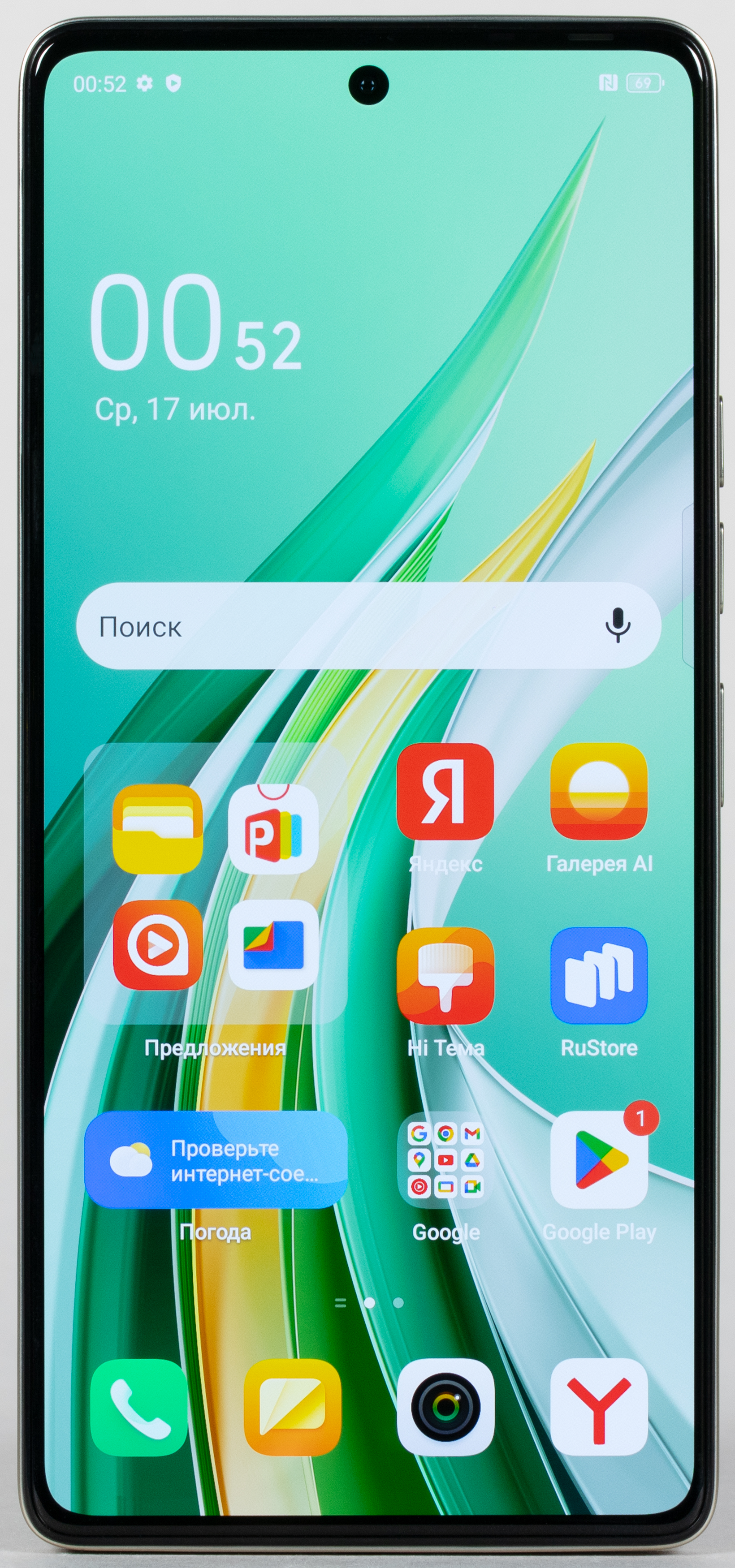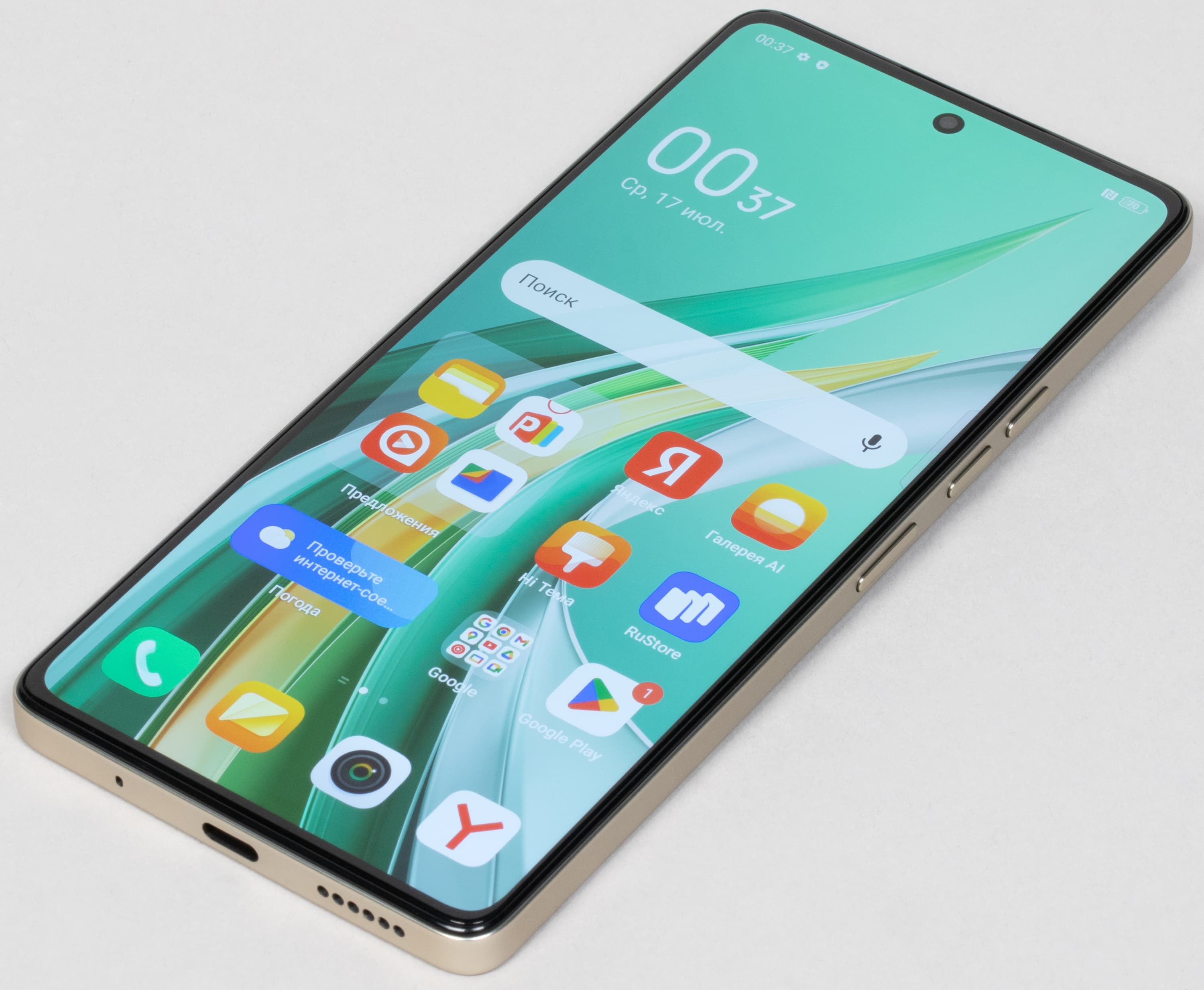 Одиночный глазок фронтальной камеры установлен за круглым вырезом в матрице экрана по центру верхней кромки.