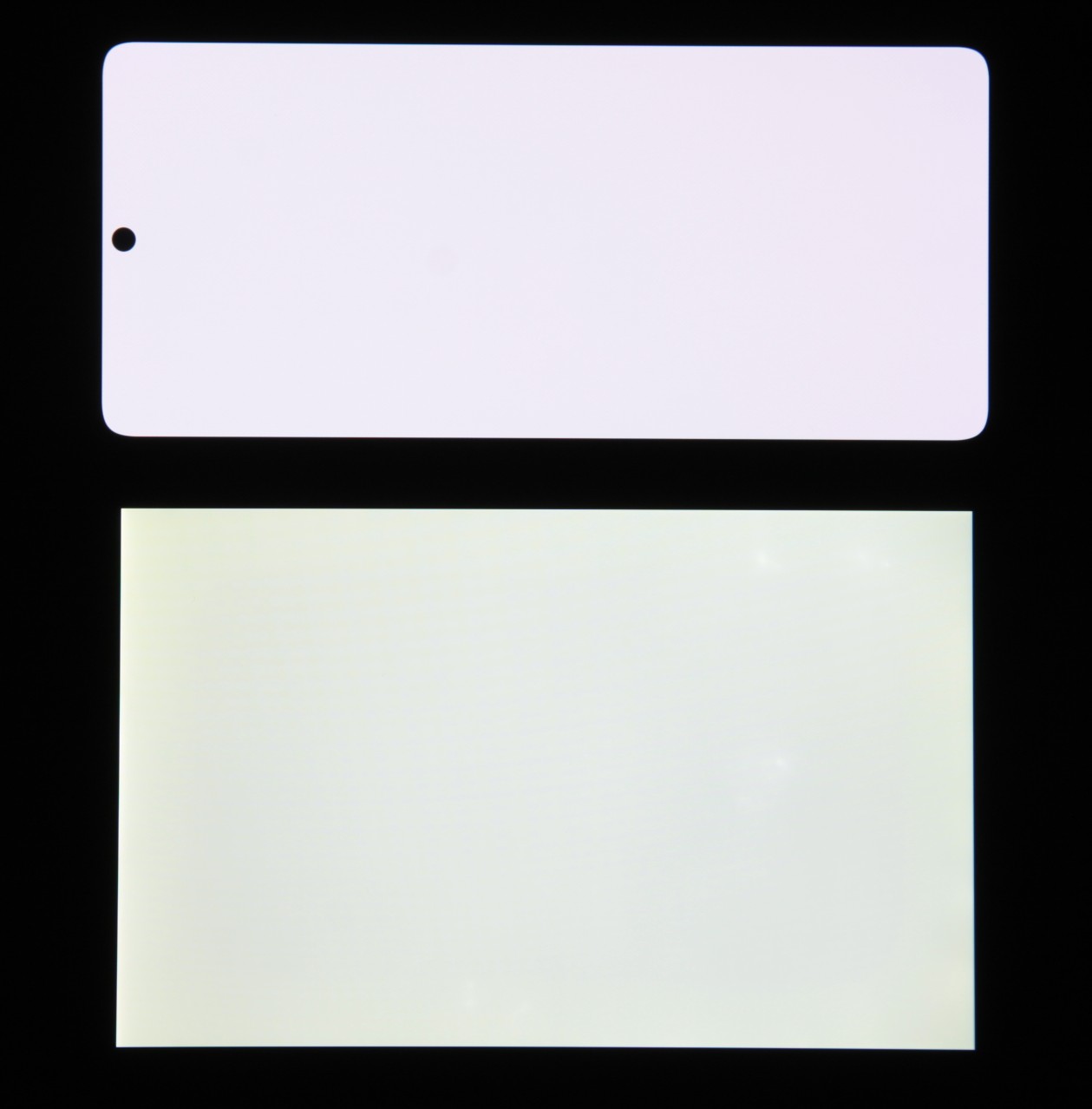 Экран характеризуется великолепными углами обзора. Яркость под углом у обоих экранов заметно уменьшается (если сравнивать с Nexus 7), но в случае смартфона падение яркости выражено гораздо меньше. В итоге, даже если установить формально одинаковую яркость, то экран этого смартфона визуально выглядит гораздо более ярким (в сравнении с ЖК-экранами), так как на экран мобильного устройства часто приходится смотреть как минимум под небольшим углом. Правда, у смартфона белый цвет при отклонении на большие углы приобретает легкий синеватый оттенок, но черный цвет остается просто черным под любыми углами.Он настолько черный, что параметр контрастности в данном случае неприменим. Для сравнения приведем фотографии, на которых на экраны смартфона и второго участника (Nexus 7; снизу — Nexus 7, сверху — смартфон, далее их можно различать по размеру) выведены одинаковые изображения, при этом яркость экранов изначально установлена примерно на 200 кд/м², а цветовой баланс на фотоаппарате принудительно переключен на 6500 К.