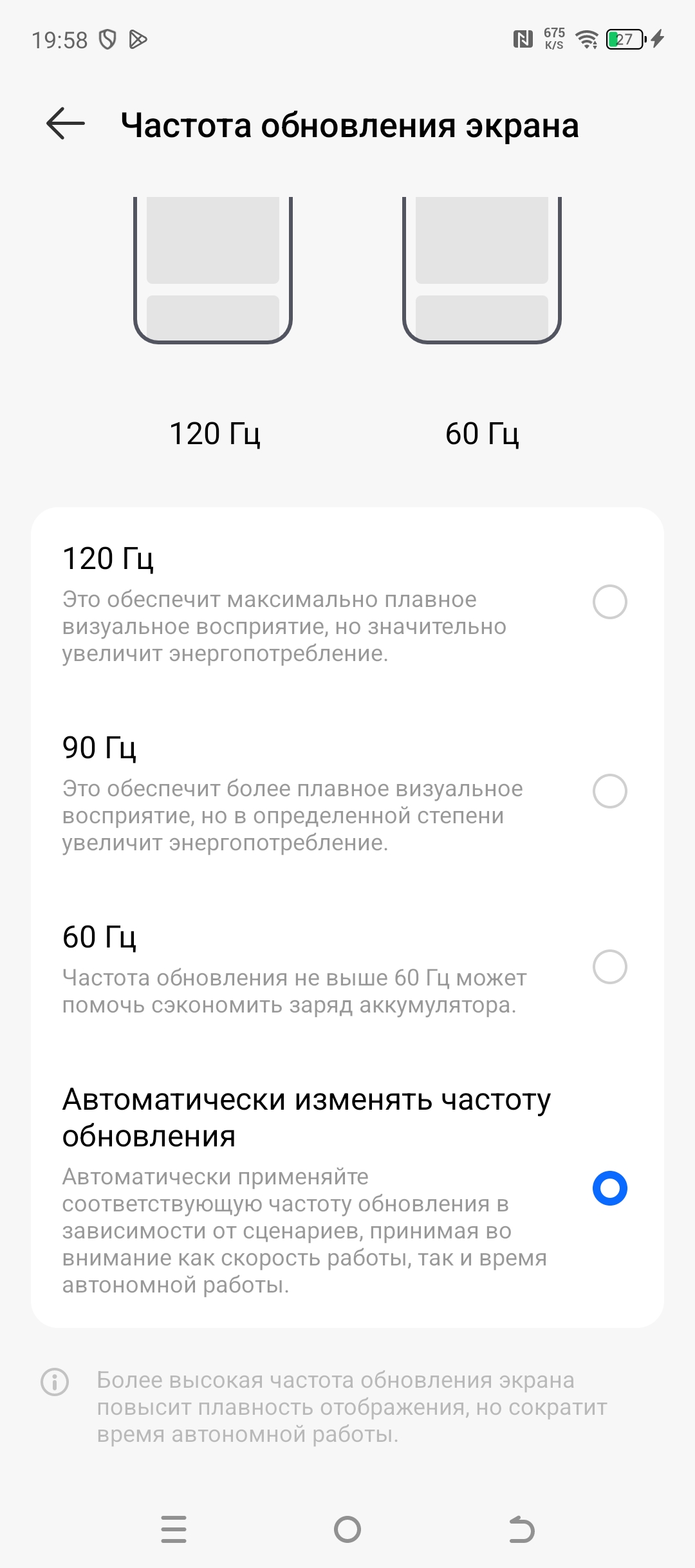В любом случае, если не касаться экрана, то через пару секунд частота обновления снижается до 60 Гц. При этом высокая частота обновления (90 и 120 Гц) включается только в каких-то избранных приложениях и в оболочке системы. Например, в случае Google Chrome частота обновления всегда 60 Гц.