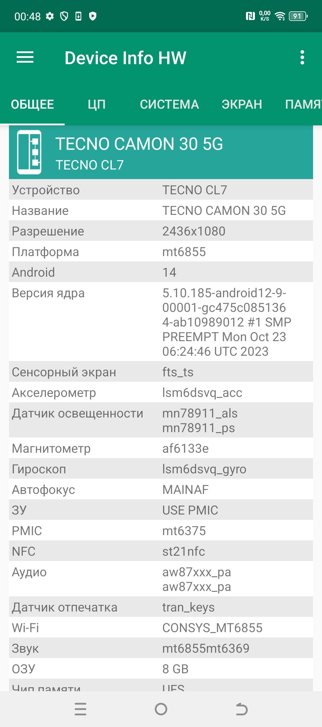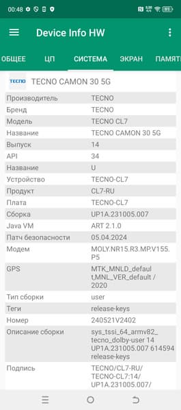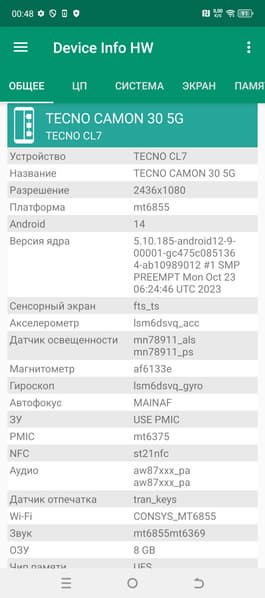 У смартфона Tecno Camon 30 5G стандартные сетевые возможности. Поддерживается большинство диапазонов мобильных сетей 4G и 5G, два диапазона Wi-Fi 6 и Bluetooth 5.3, есть поддержка NFC, но нет поддержки e-SIM. На практике в пределах городской черты московского региона аппарат демонстрирует уверенную работу в беспроводных сетях, не теряет связь, быстро восстанавливает связь после вынужденного обрыва. Все необходимые встроенные датчики, вплоть до гироскопа, на месте.
