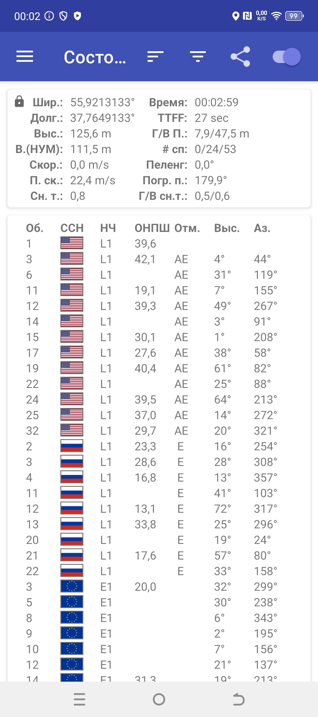 Одноканальный модуль спутниковой навигации работает с GPS, а также с Глонасс, BDS и Galileo. Первые спутники при холодном старте обнаруживаются быстро, точность позиционирования не вызывает претензий.