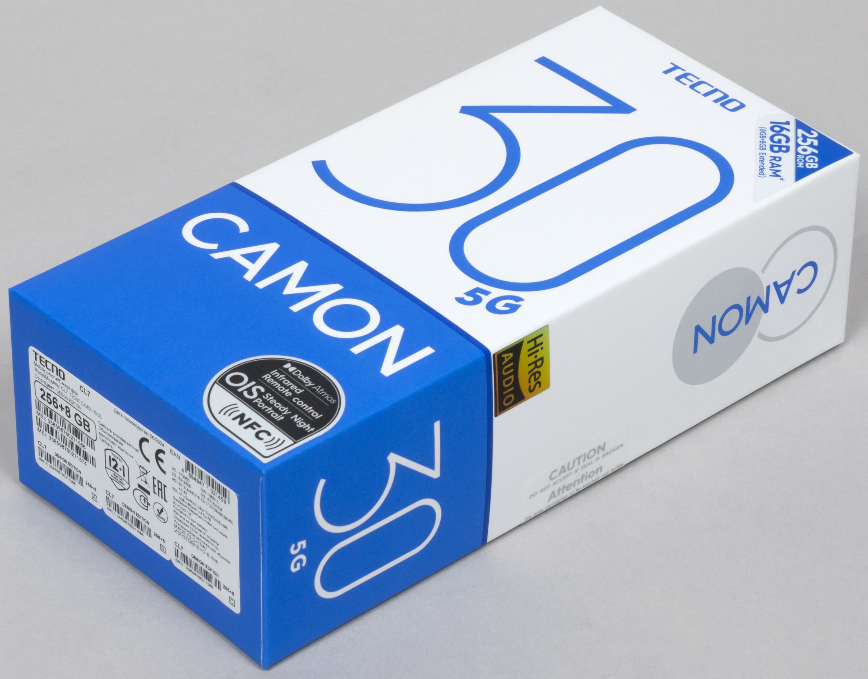 Смартфон Tecno Camon 30 5G поставляется в картонной коробке с оформлением в фирменных цветах бренда.