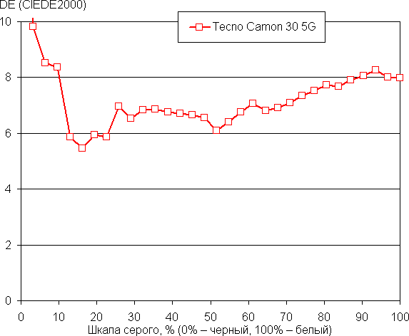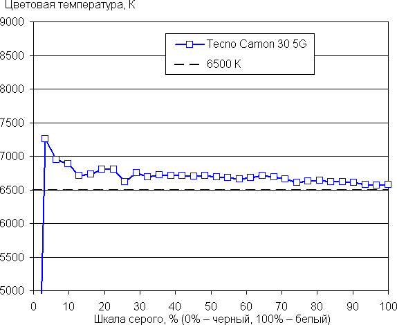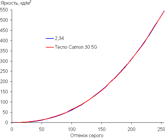 Напомним, что в случае OLED-экранов яркость фрагментов изображения динамично меняется в соответствии с характером выводимого изображения — слегка уменьшается для светлых в целом изображений. В итоге полученная зависимость яркости от оттенка (гамма-кривая), скорее всего, немного не соответствует гамма-кривой статичного изображения, так как измерения проводились при последовательном выводе оттенков серого почти на весь экран.