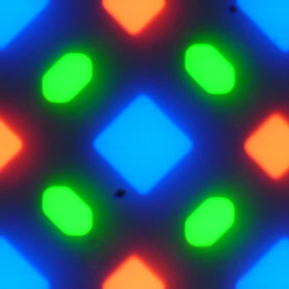 В этом экране используется матрица AMOLED — активная матрица на органических светодиодах. Полноцветное изображение создается с помощью субпикселей трех цветов — красного (R), зеленого (G) и синего (B), но красных и синих субпикселей в два раза меньше, что можно обозначить как RGBG. Это подтверждается фрагментом микрофотографии: