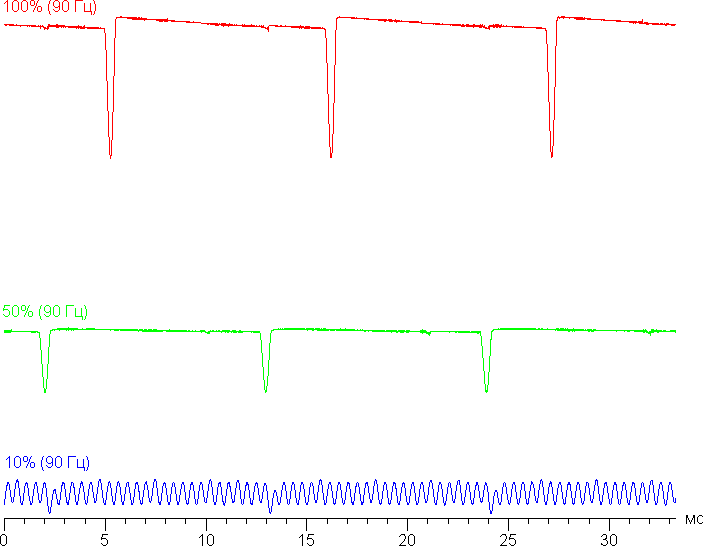 Видно, что на высокой и средней яркости частота модуляции увеличилась до 90 Гц, а на низкой характер модуляции такой же, что и в случае частоты обновления 60 Гц. Видимого мерцания всё так же нет.