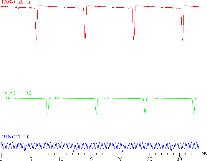 Частота модуляции на высокой и средней яркости увеличилась теперь уже до 120 Гц, а на низкой характер модуляции такой же, как и в случае частоты обновления 60 Гц. Повторим: видимого мерцания нет.