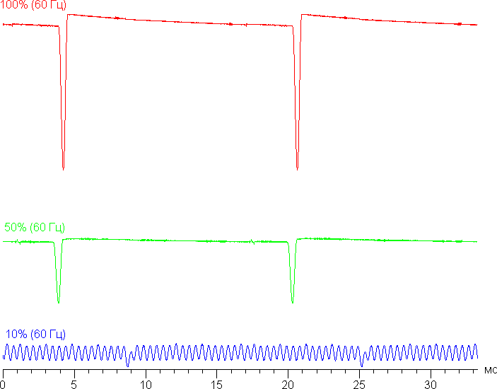 Видно, что на высокой и средней яркости частота невысокая (60 Гц), но и скважность модуляции низкая, к тому же фаза модуляции различается по площади экрана, в итоге видимого мерцания нет. При сильном понижении яркости появляется модуляция с высокой частотой (2,16 кГц) поэтому видимое мерцание всё так же отсутствует.