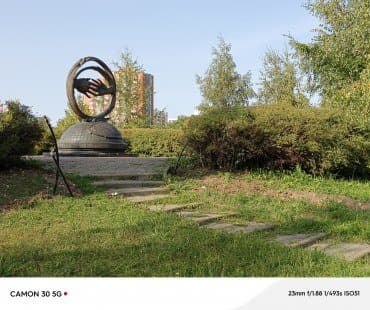При хорошем освещении камера снимает очень хорошо для недорогого смартфона. В одном месте у края кадра есть пятно нерезкости, а шарпинга чуть многовато, но по большому счету, придраться-то и не к чему. Детализация, четкость, контраст, объем — всё в норме. Фотографии обходятся без пересветов и недоэкспонированных участков, получаются сочные и яркие — ну, может, чуть приукрашенные по цветам.
