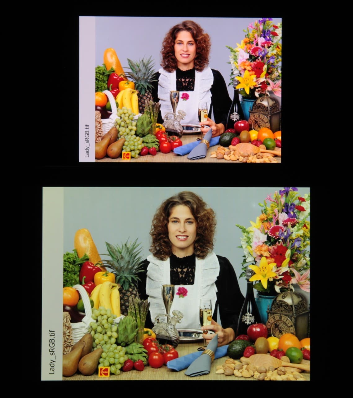 Цвета на экране смартфона перенасыщены (обратите внимание на помидоры, бананы, салфетку и оттенок лица), а цветовой баланс заметно отличается. Напомним, что фотография не может служить надежным источником сведений о качестве цветопередачи и приводится только для условной наглядной иллюстрации. В частности, выраженный красноватый оттенок белого и серого полей, присутствующий на фотографиях экрана смартфона, при перпендикулярном взгляде визуально отсутствует, что подтверждается аппаратными тестами с помощью спектрофотометра. Причина в том, что спектральная чувствительность матрицы фотоаппарата неточно совпадает с этой характеристикой человеческого зрения.