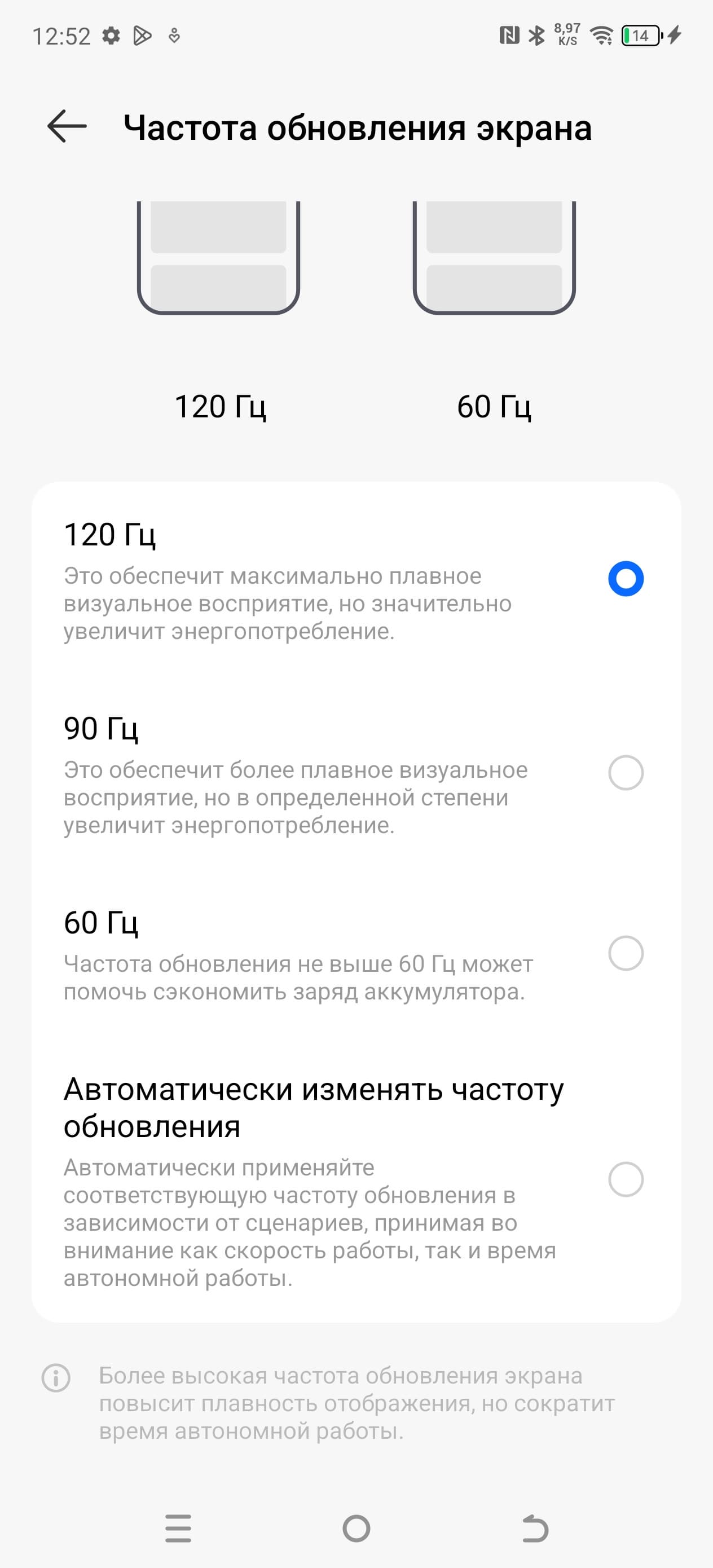 В настройках экрана можно включить режим с повышенной до 90 и 120 Гц частотой обновления: