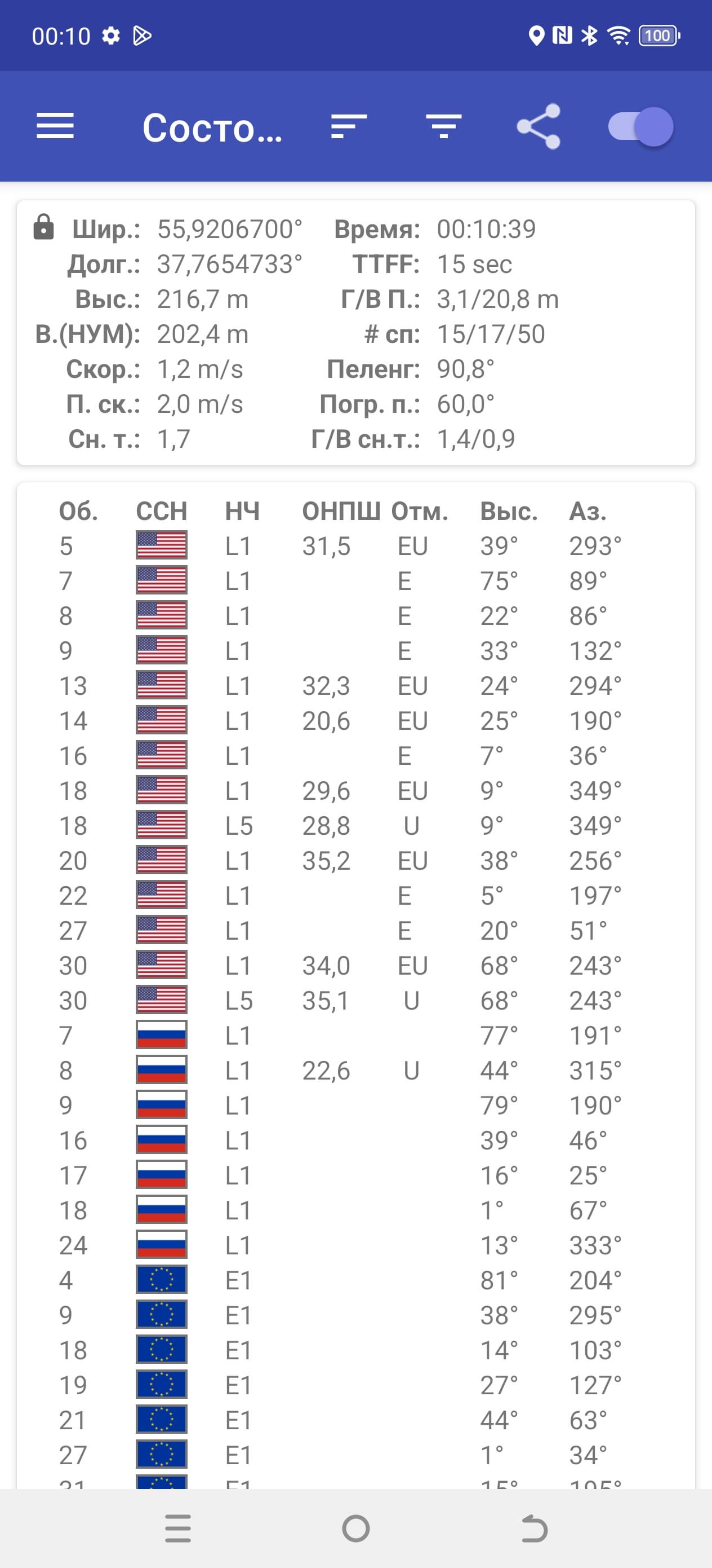 Двухканальный модуль спутниковой навигации работает с GPS (L1+L5), а также BDS, Galileo и Глонасс. Первые спутники при холодном старте обнаруживаются быстро, точность позиционирования не вызывает претензий.