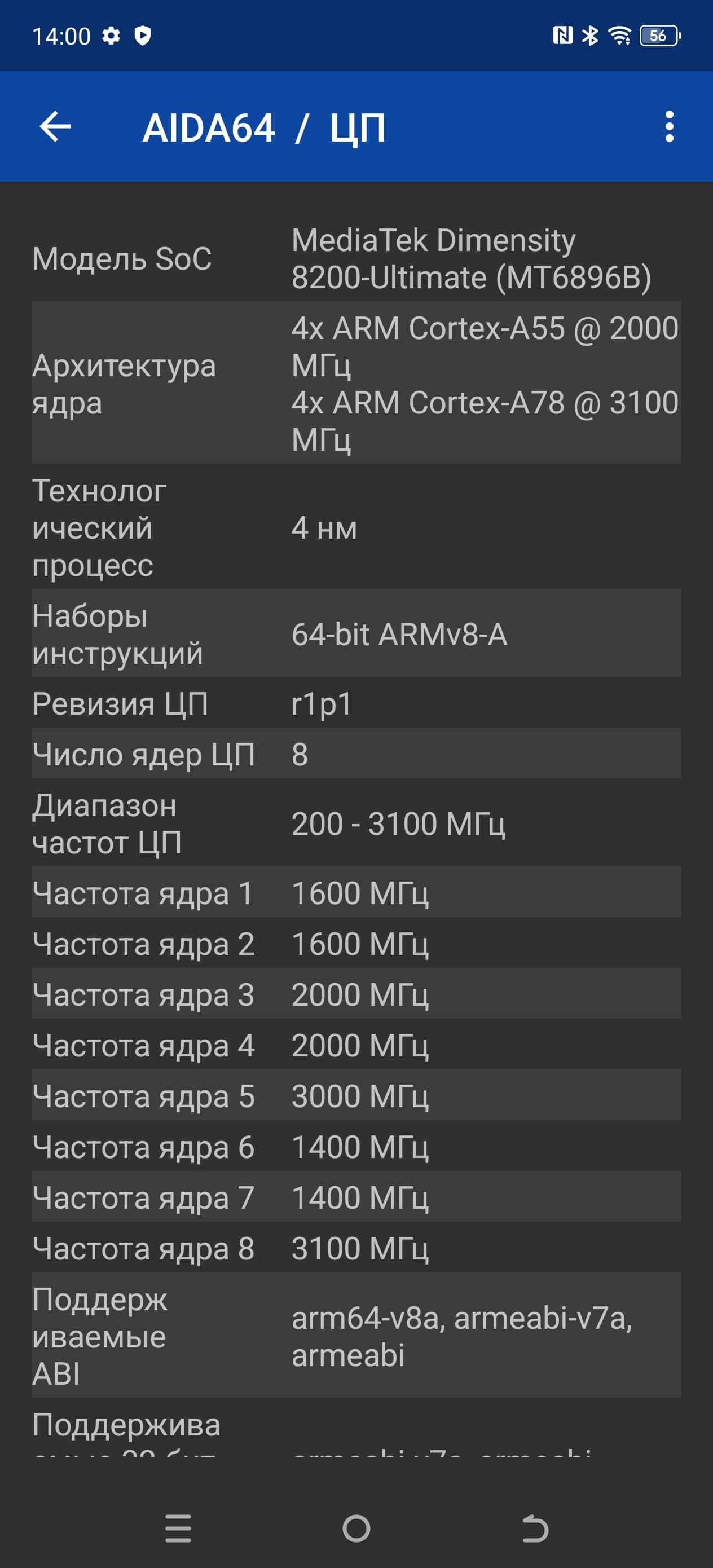 - SoC Mediatek Dimensity 8200 Ultimate, 8 процессорных ядер (1×Cortex-A78 @3,1 ГГц + 3×Cortex-A78 @3,0 ГГц + 4×Cortex-A55 @2,0 ГГц)