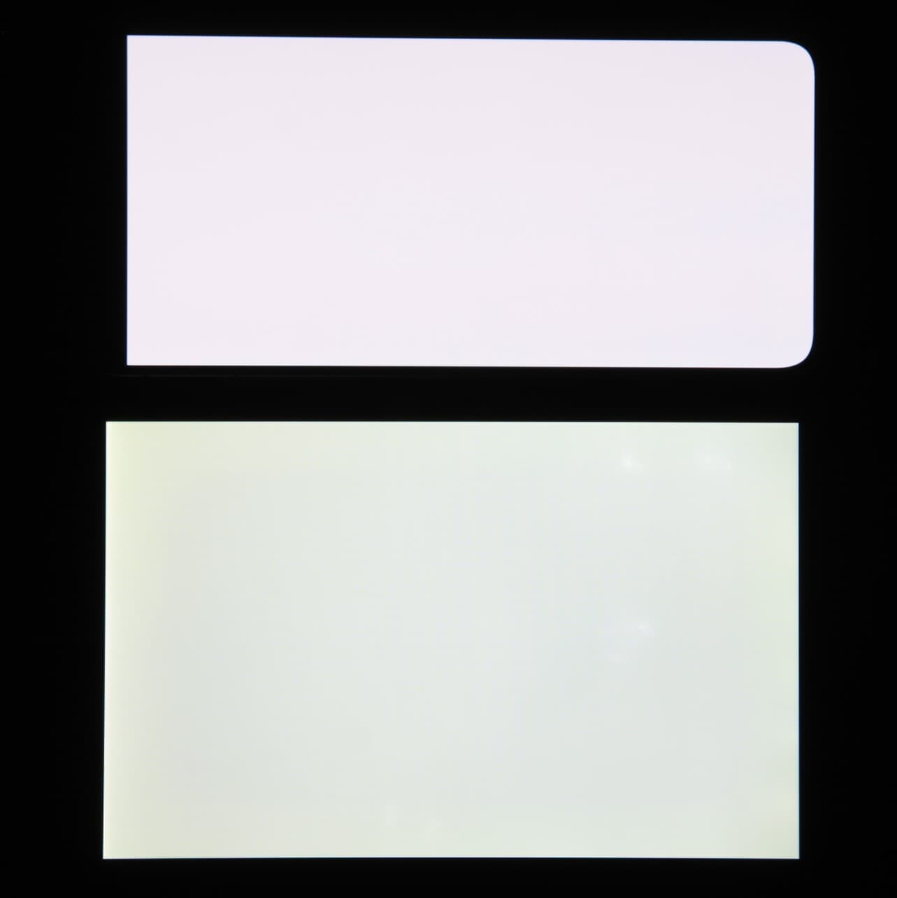 Экран характеризуется великолепными углами обзора. Правда, белый цвет при отклонении на большие углы приобретает легкий сине-зеленый оттенок, но черный цвет остается просто черным под любыми углами. Он настолько черный, что параметр контрастности в данном случае просто неприменим. Для сравнения приведем фотографии, на которых на экраны смартфона и второго участника (Nexus 7; снизу — Nexus 7, сверху — смартфон, далее их можно различать по размеру) выведены одинаковые изображения, при этом яркость экранов изначально установлена примерно на 200 кд/м², а цветовой баланс на фотоаппарате принудительно переключен на 6500 К.