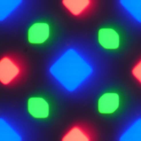 В этом экране используется матрица AMOLED — активная матрица на органических светодиодах. Полноцветное изображение создается с помощью субпикселей трех цветов — красного (R), зеленого (G) и синего (B), но красных и синих субпикселей в два раза меньше, что можно обозначить как RGBG. Это подтверждается фрагментом микрофотографии: