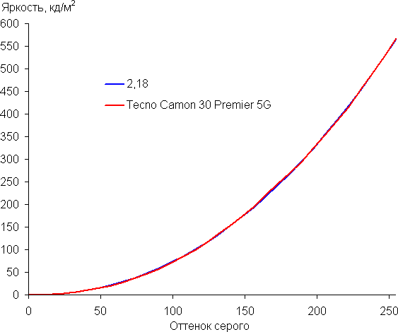 Построенная по 32 точкам с равным интервалом по численному значению оттенка серого гамма-кривая не выявила завала ни в тенях, ни в светах. Показатель аппроксимирующей степенной функции равен 2,18, что близко к стандартному значению 2,2. При этом реальная гамма-кривая мало отклоняется от степенной зависимости: