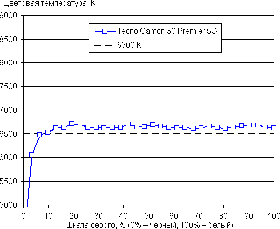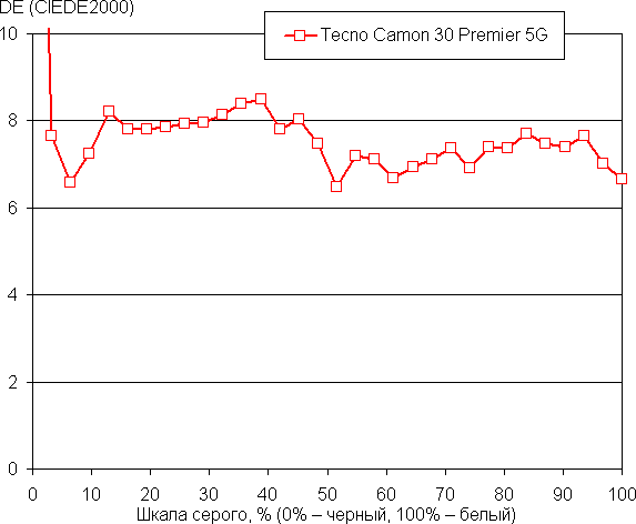 Напомним, что в случае OLED-экранов яркость фрагментов изображения динамично меняется в соответствии с характером выводимого изображения — слегка уменьшается для светлых в целом изображений. В итоге полученная зависимость яркости от оттенка (гамма-кривая), скорее всего, немного не соответствует гамма-кривой статичного изображения, так как измерения проводились при последовательном выводе оттенков серого почти на весь экран.
