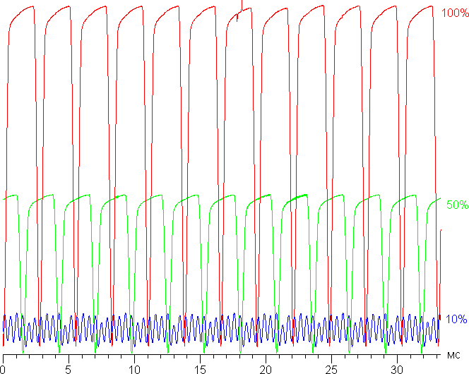 На высоком и среднем уровне яркости присутствует значимая модуляция с частотой примерно 360 Гц. На рисунках ниже приведены зависимости яркости (вертикальная ось) от времени (горизонтальная ось) для нескольких значений настройки яркости: