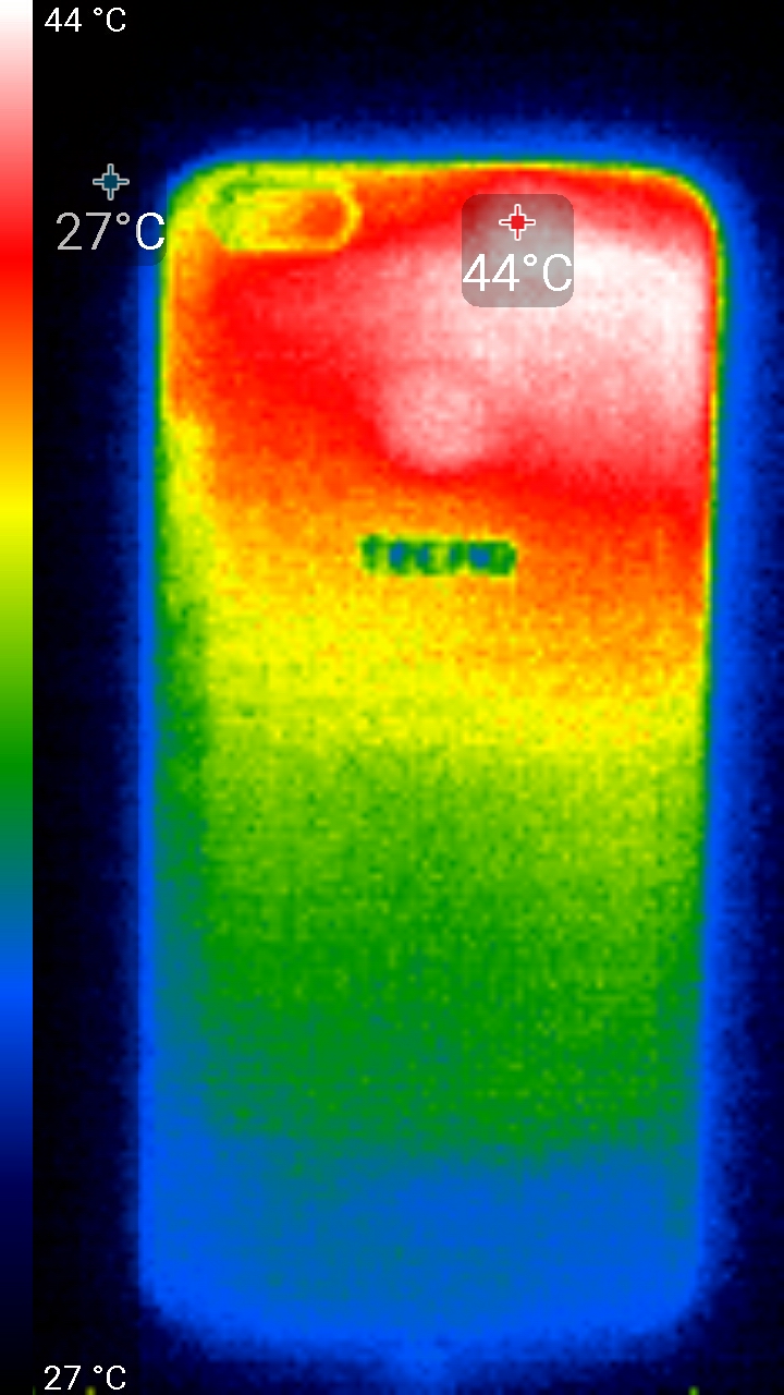 Нагрев локализован в верхней левой части аппарата, что, видимо, соответствует расположению микросхемы SoC. По данным теплокамеры, максимальный нагрев составил 44 градуса (при температуре окружающего воздуха в 24 градуса), это выше среднего значения в данном тесте для современных смартфонов.
