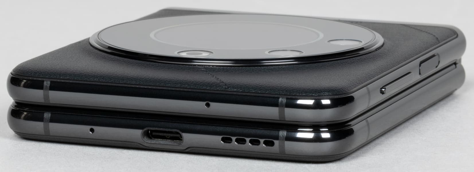 Что касается шарнира — он в меру жесткий, половинки в полураскрытом состоянии не «гуляют», удерживаются крепко, а в конце хода четко фиксируются. Но это не та «раскладушка» из прошлого, которую можно было изящно раскрыть одной рукой. Здесь так не выйдет: половинки слишком широкие, тяжелые, да и шарнир жестковат. Зато в раскрытом положении аппарат ощущается как литой — ничего не люфтит и не гуляет, практически моноблок.