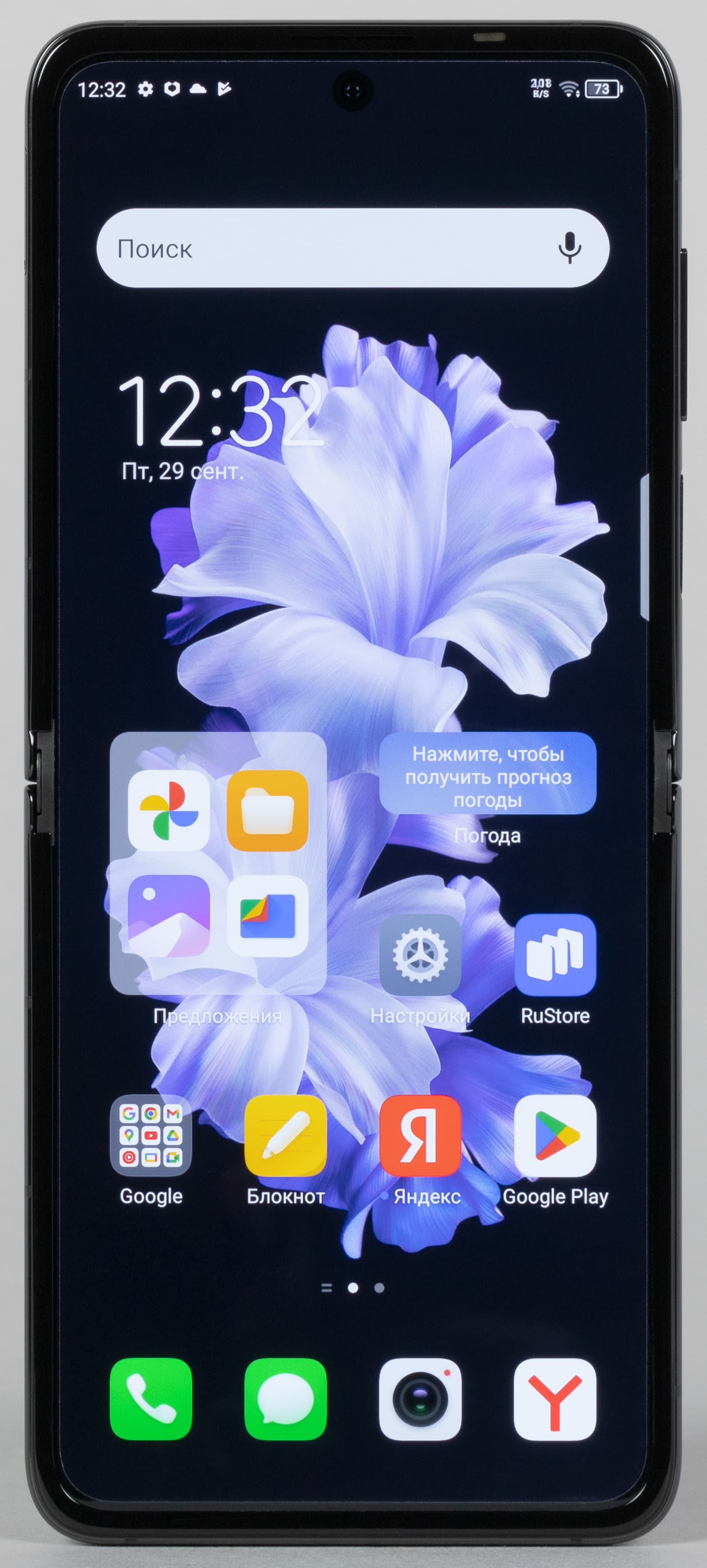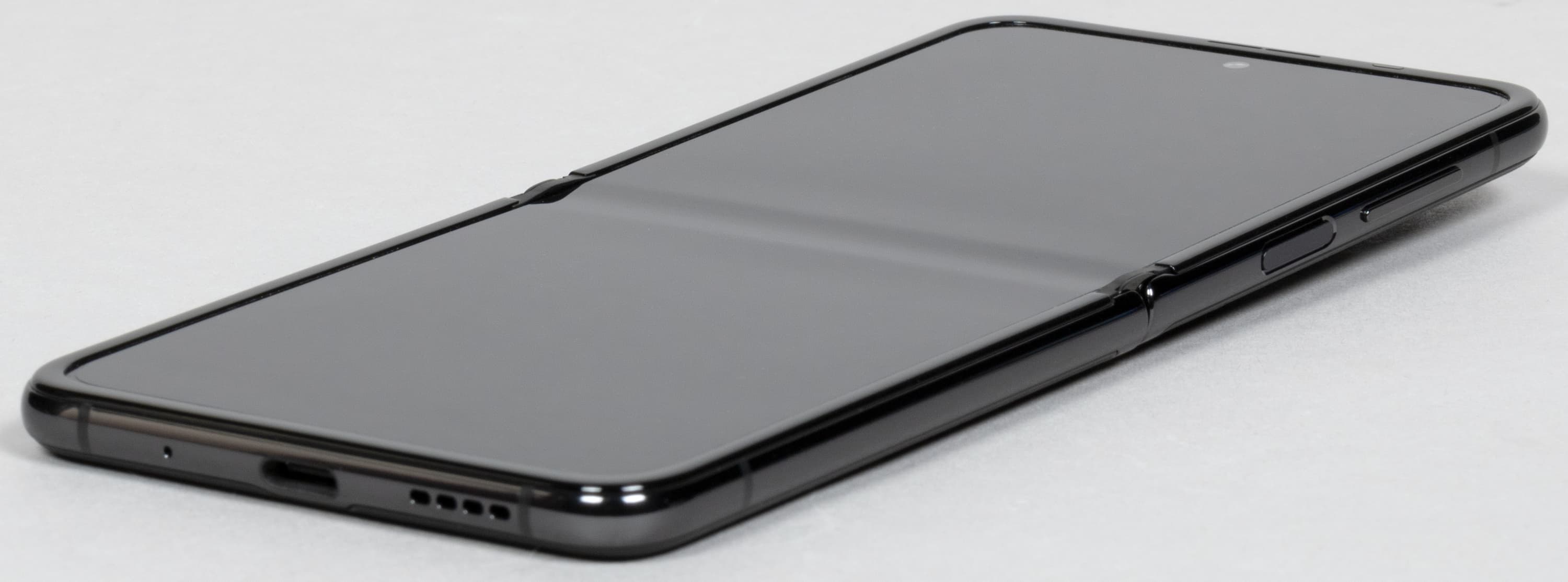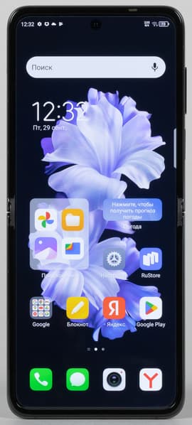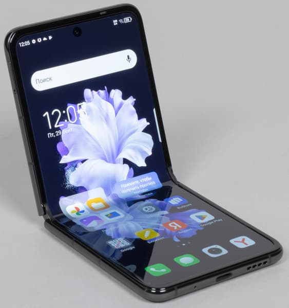 В раскрытом виде «морщина» на гибком дисплее есть, она видна и прощупывается. На твердой поверхности полностью разложенный смартфон практически не покачивается при работе.