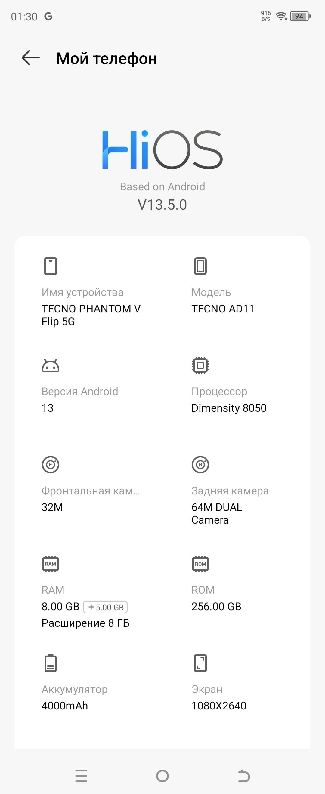В качестве программной платформы Tecno Phantom V Flip 5G использует версию ОС Android 13 с собственной оболочкой HiOS 13.5. Это обычный китайский интерфейс, насыщенный всевозможными дополнительными функциями, жестами и выдвижными панелями. Рекламы нет. Есть некоторое количество дополнительных предустановленных программ и приложений, однако нет ничего специфического, связанного с раскладывающимся экраном. Всё стандартно. Официальный доступ к сервисам и магазину Google на месте.