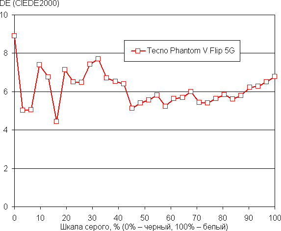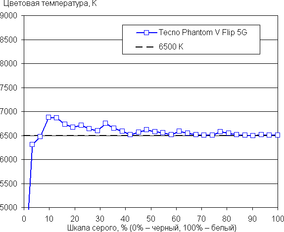 Баланс оттенков на шкале серого в случае профиля Оригинальный цвет после небольшой коррекции приемлемый, так как цветовая температура становится близкой к стандартным 6500 К, а отклонение от спектра абсолютно черного тела (ΔE) остается ниже 10 единиц, что для потребительского устройства считается приемлемым показателем (без коррекции на белом поле 7800 К и 1,0, соответственно). При этом цветовая температура и ΔE мало изменяются от оттенка к оттенку — это положительно сказывается на визуальной оценке цветового баланса.