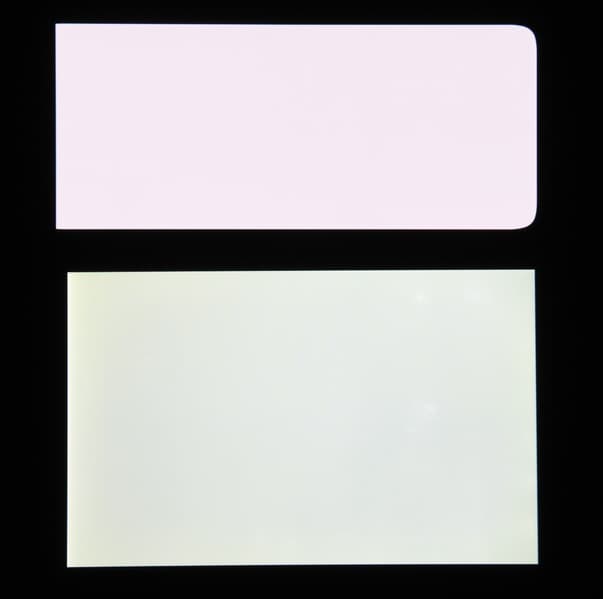 Экран характеризуется великолепными углами обзора. Правда, белый цвет при отклонении на большие углы приобретает легкий сине-зеленый оттенок, но черный цвет остается просто черным под любыми углами. Он настолько черный, что параметр контрастности в данном случае просто неприменим. Для сравнения приведем фотографии, на которых на экраны смартфона и второго участника (Nexus 7; снизу — Nexus 7, сверху — смартфон, далее их можно различать по размеру) выведены одинаковые изображения, при этом яркость экранов изначально установлена примерно на 200 кд/м², а цветовой баланс на фотоаппарате принудительно переключен на 6500 К.