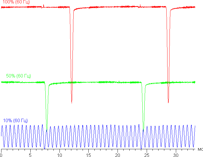 Видно, что на высокой и средней яркости частота невысокая (60 Гц), но скважность модуляции низкая, к тому же фаза модуляции различается по площади экрана, в итоге видимого мерцания нет. При сильном понижении яркости появляется модуляция с высокой частотой (1,44 кГц) поэтому видимое мерцание всё так же отсутствует.