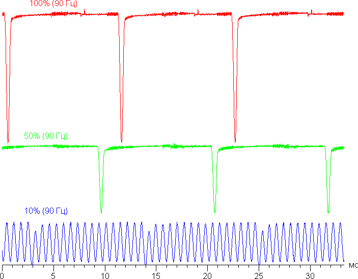 Видно, что на высокой и средней яркости частота модуляции увеличилась до 90 Гц, а на низкой характер модуляции такой же, как и в случае частоты обновления 60 Гц. Видимого мерцания тоже нет.